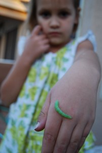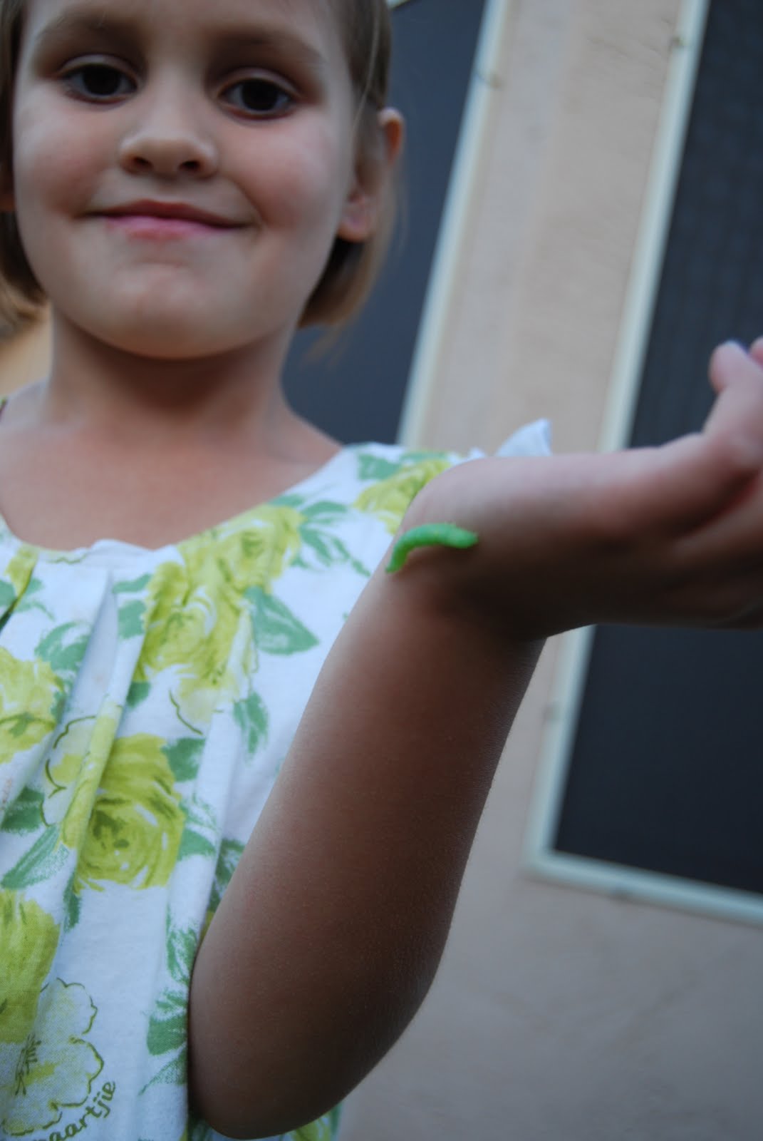 We have been working at this garden, not only growing stuff but we are composting too! I had no idea how much fun gardening can be! Showing the kids how food grows is such a fun experience and it is a great way for us all to be outside together each evening, watering and taking inventory of what is growing, what isn’t doing so well and of course eating the fruits of our labor. Andi Jane’s favorite thing about the garden is this little caterpiller she has dubbed, her pet.