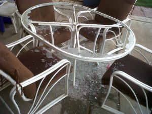 Lily’s caregiver Sharon met us at the house and watched Lily and Andi while Ollie and I had to run to the grocery store. Finally we get home, I walk through the back yard to check out how wet the garden got and I see our patio glass table shattered. Totally shattered.