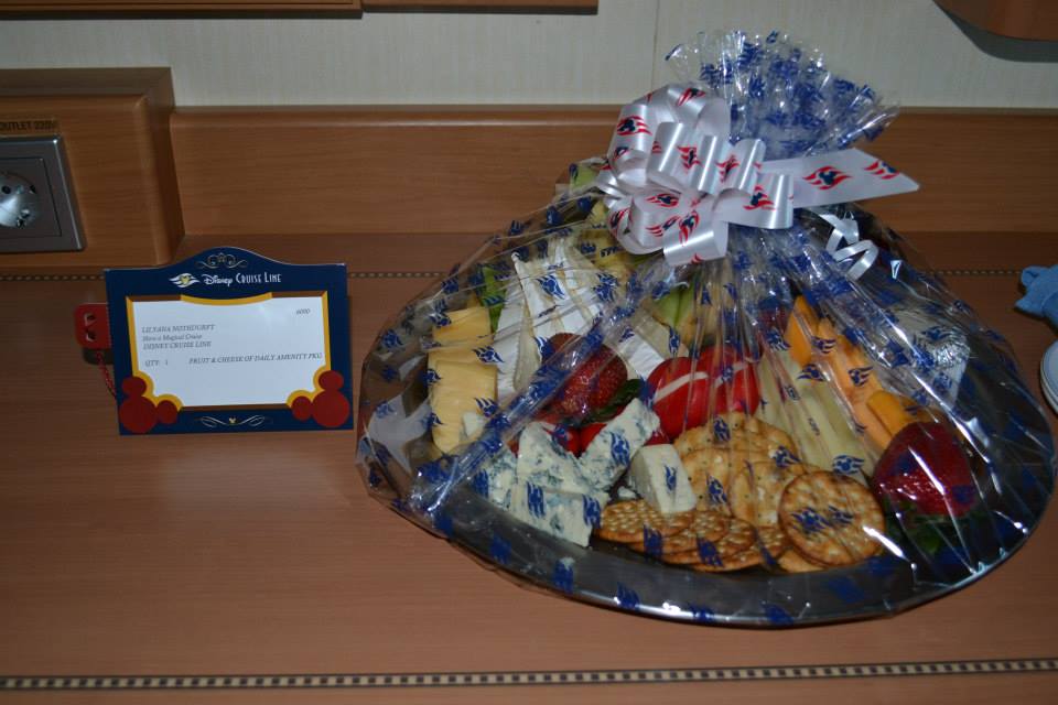 Finally we get to our stateroom! Holy smokes! It is huge! Everyone says on cruise rooms are so small, but thanks to Disney and Make A Wish, not for us! We have a welcome fruit and cheese basket/tray and a welcome packet about our weekend.